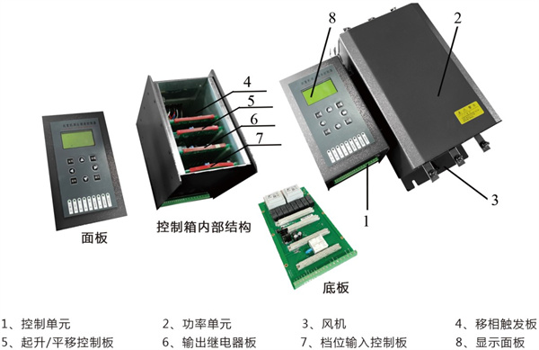 結(jié)構(gòu)及技術(shù)指標(biāo)GVDJ控制器由控制單元和功率單元組成,兩者固定為一體。電氣連接方式通過矩形插座連線連接,控制單元由升降控制板(GV-002DI)/(平移控制板GV-003DI)、輸岀板(GV-004DI、GV-008DI)、檔位輸入控制板(GV-009DI)、移相觸發(fā)板GV-005DI)、顯示板(GV-015DI)及案板(GV-006DI)組成。功率單元由晶閘管、散熱器、壓敏電阻、阻容保護(hù)模塊、溫度繼電器及風(fēng)扇組成。整體結(jié)構(gòu)如下圖所示: